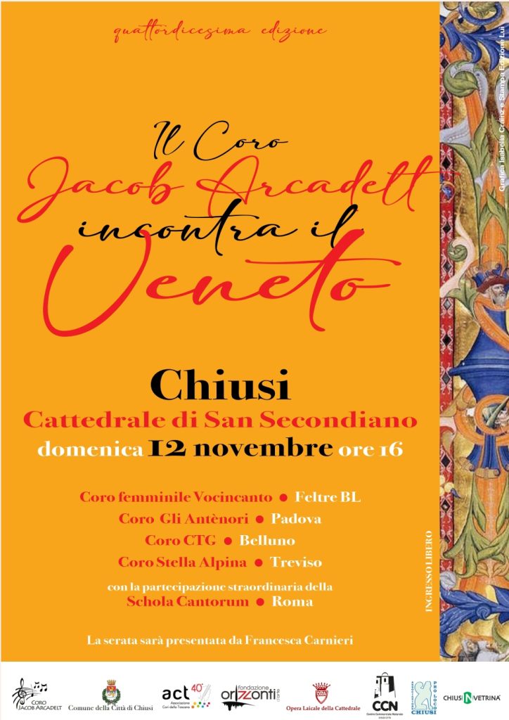 Domenica 12 Novembre ore 16:00 CORO JACOB ARCADELT incontra il Veneto. Ogni anno il Coro Jacob Arcadelt organizza una Rassegna a cui vengono invitati cori provenienti da ogni parte d’Italia e anche da paesi esteri. Quest’anno si è deciso di organizzarla legata alle Regioni o ad altri spazi geografici, nello specifico al Veneto. Domenica alle […]