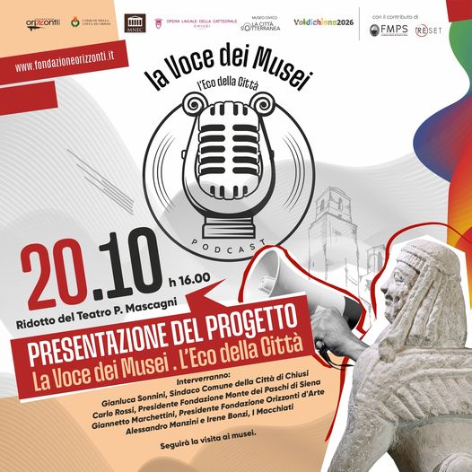 Sarà presentato venerdì 20 ottobre alle ore 16, al ridotto del Teatro Mascagni, il progetto 𝗟𝗮 𝗩𝗼𝗰𝗲 𝗱𝗲𝗶 𝗠𝘂𝘀𝗲𝗶. 𝗟’𝗲𝗰𝗼 𝗱𝗲𝗹𝗹𝗲 𝗰𝗶𝘁𝘁𝗮̀, con il quale si presenterà la realizzazione di audio-percorsi di tipo narrativo-teatrali per adulti e bambini per ciascun museo della Città di Chiusi. 𝘐𝘯𝘵𝘦𝘳𝘷𝘦𝘳𝘳𝘢𝘯𝘯𝘰: . 𝘎𝘪𝘢𝘯𝘭𝘶𝘤𝘢 𝘚𝘰𝘯𝘯𝘪𝘯𝘪 Sindaco della Città di Chiusi, . […]