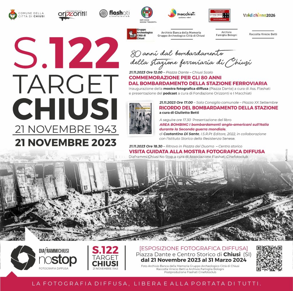 Il programma della giornata di martedì 21 novembre: 𝑜𝘳𝑒 12 – 𝘗𝑖𝘢𝑧𝘻𝑎 𝐷𝘢𝑛𝘵𝑒 Commemorazione per gli 80 anni del bombardamento della stazione ferroviaria. Presentazione della mostra fotografica diffusa S.122 Target Chiusi – a cura di Ass. Flashati di Chiusi; e del podcast a cura di Fondazione Orizzonti d’arte e I Macchiati. 𝘰𝑟𝘦 17 – 𝑆𝘢𝑙𝘢 […]