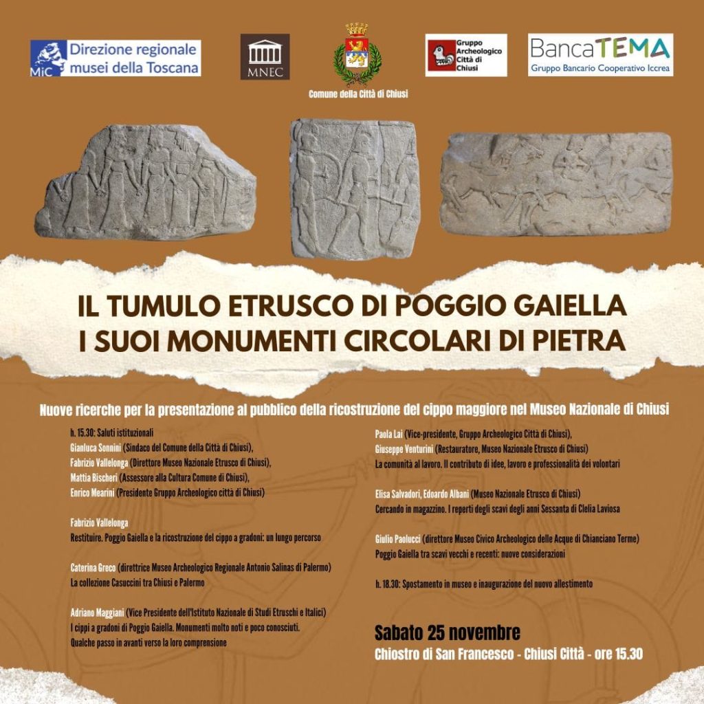 Inaugurazione della nuova ricostruzione del monumento circolare etrusco di Poggio Gaiella Dopo alcuni anni in magazzino tornano in museo i rilievi di Poggio Gaiella con una nuova proposta ricostruttiva Sabato 25 novembre 2023, ore 15.30 Chiostro di San Francesco – Chiusi Città Nel corso dell’incontro verranno illustrate le vicende e le ricerche che hanno portato […]