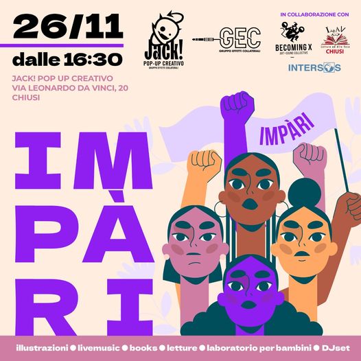 Dalle ore 16:30, Jack! Pop Up Creativo, Chiusi Scalo Organizzato da GEC-Gruppo Effetti Collaterali 𝑰𝒎𝒑𝒂𝒓𝒊 -Live drawing del Becoming X Art+Sound Collective -“Senza chiedere il permesso”, letture a voce alta con la Biblioteca Comunale di Chiusi e le volontarie del circolo LAAV di Chiusi -Talk “LE MAREE volontariato, ONG, attivismo e associazionismo contro la violenza […]