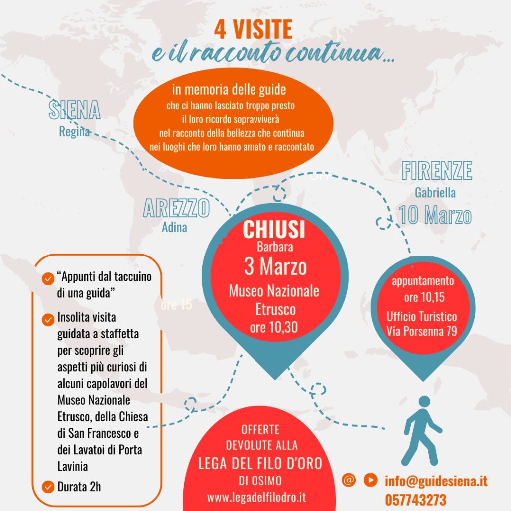“𝟒 𝐕𝐈𝐒𝐈𝐓𝐄 𝐞 𝐢𝐥 𝐫𝐚𝐜𝐜𝐨𝐧𝐭𝐨 𝐜𝐨𝐧𝐭𝐢𝐧𝐮𝐚…” Domenica 3 marzo alle ore 10:30 Chiusi: un itinerario in un luogo molto amato da Barbara Batelli, a cui è dedicata la visita. Vi condurremo alla scoperta dei tesori della civiltà etrusca, ma anche di luoghi meno conosciuti, alcuni straordinariamente aperti per questa occasione. Barbara amava molto il suo […]